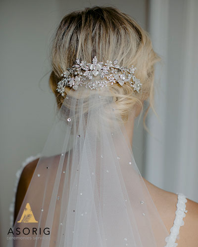 عروس موهایش را به شکل تاج بافته ای درآورده بود که تارهای صورت او را حفظ میکرد و با حجابش عالی به نظر می رسید. برای زیباتر کردن این مدل، قسمت بافته شده با سنجاق های مروارید تزئین شده بود.