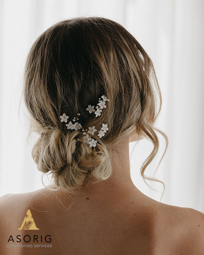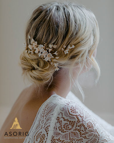 موهای ساده این عروس که به نرمی با گیره های چشمگیر نگهداری شده است، اجازه می دهد تا اکسسوری های دیگر از جمله گوشواره و گردنبند نیز اجازه داشته باشند تا خودنمایی کنند.