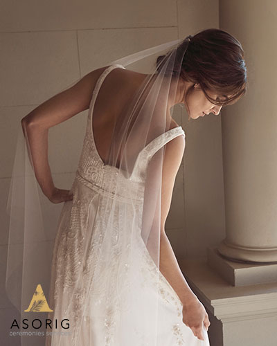 علاوه بر جزئیات سفارشی این لباس مجلسی که عروس به طراحی خودش کمک کرده است نباید از مدل موی آن غافل شد. وجود یک بان ساده و کلاسیک هارمونی زیبایی با لباس عروس ایجاد کرده است.