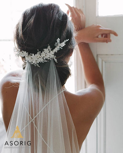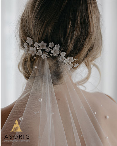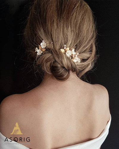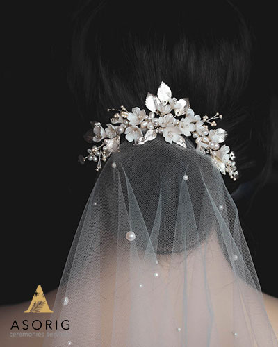 عروس موهایش را به شکل تاج بافته ای درآورده بود که تارهای صورت او را حفظ میکرد و با حجابش عالی به نظر می رسید. برای زیباتر کردن این مدل، قسمت بافته شده با سنجاق های مروارید تزئین شده بود.